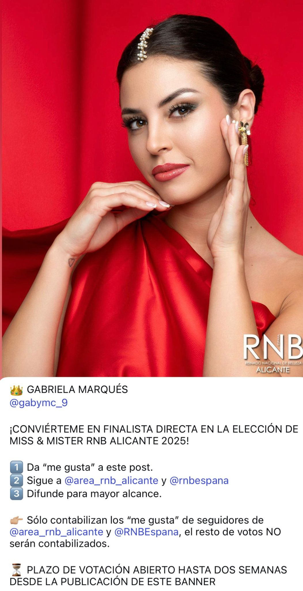 A pesar de los obstáculos, Gabriela Marqués ha demostrado que su carisma va más allá de los algoritmos. Su foto oficial como candidata a Miss Alicante RNB fue eliminada en dos ocasiones de Instagram, un hecho que muchos han interpretado como una trampa injusta dentro del certamen. Sin embargo, lejos de desanimarse, Gabriela ha seguido ganando apoyo: hoy es la candidata más votada por el público, lo que confirma que su luz brilla con fuerza, incluso cuando intentan apagarla.